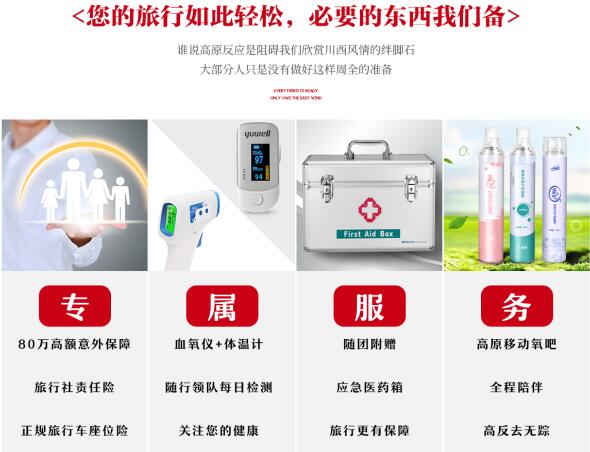 4.一份專業:全團配備公用應急藥箱1個、全團配備公用血氧儀1個、全團配備溫度計1支、全團貴賓每日血氧監測1次,線路專屬紀念橫幅1條、各種擺拍新潮手拉旗子若干。刷出來的好評叫營銷,做出來的好評叫品質!