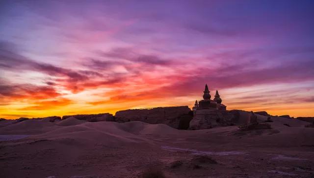 午后趕到【黑城遺址】(游覽時間約30分鐘)。(國慶時人多車堵,建議大家備一些干糧帶上)西夏古城黑水城位于內蒙古西部額濟納旗巴丹吉林沙漠西北部,在西夏和元代時最為鼎盛,是古代絲綢之路上的重要城市。20世紀初,俄國軍人科茲洛夫和英國人斯坦因才在黑水城發現了大量的西夏文獻,并運送出境由于沙化嚴重,黑水城四周的城墻已有半數為流沙掩埋。遺址西北角上聳立的佛塔,基座也被風沙剝蝕得裂痕斑斑,城中殘垣斷壁隨處可見。黑水城經歷了歲月的滄桑,帶著風沙的刻痕,在茫茫沙漠和戈壁依然聳立;
