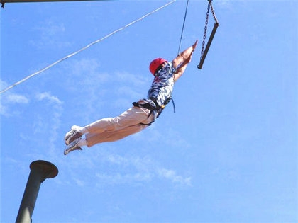 項目介紹:學(xué)員要爬上一根8米高的柱子,站在其頂端(無任何依附物并微晃的圓盤上),平伸雙臂,奮力跳出去抓住正前上方懸掛著的單杠。