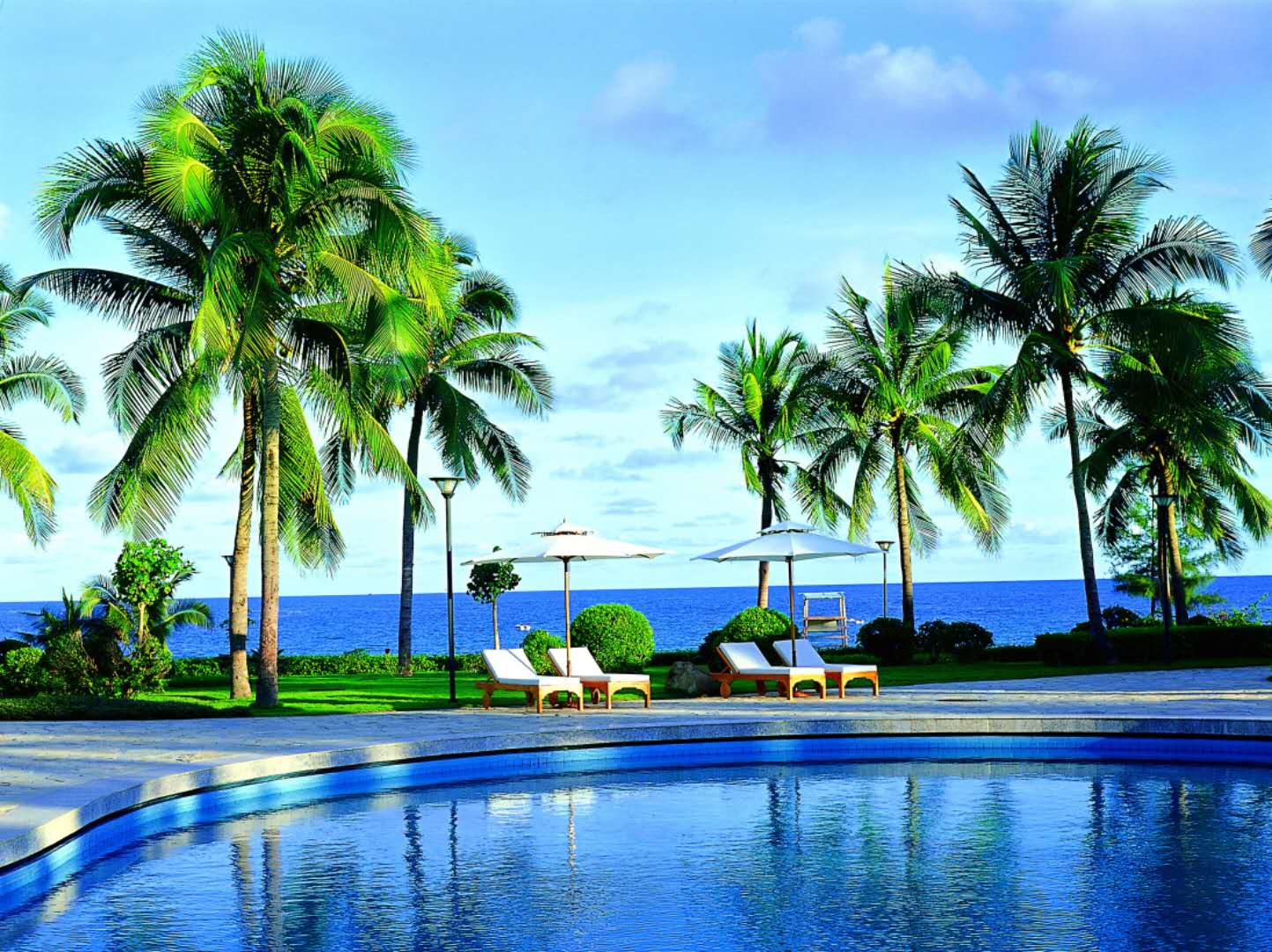 灣內(nèi)植被繁茂,有大片椰林、橡膠等熱帶作物,椰樹檳榔,相映成趣。白沙碧海,藍天流云,自成畫卷,更有青梅翠帶,溪流湖泊,秀嶼奇石,細浪柔沙,美不勝收。