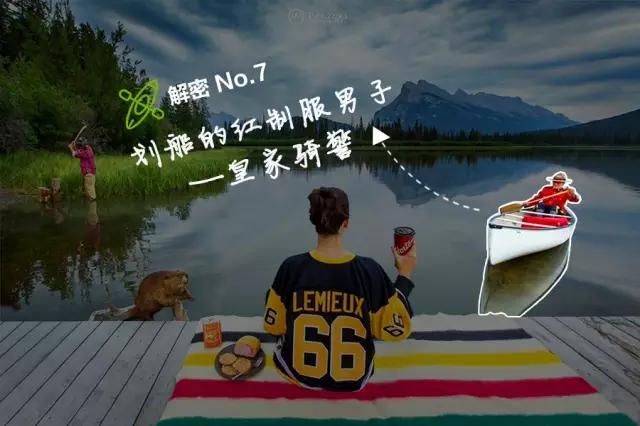 湖面上有一位身著紅色帥氣制服在湖上劃船的男子,他是誰呢?原來是加拿大國家象征之一:皇家騎警(RCMP)。他表達出了加拿大人對落基山戶外探索精神最崇尚的無限崇尚。