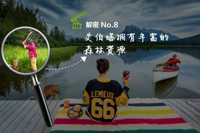圖片左上角的伐木人突出了樹木在加拿大艾伯塔人生活中的重要性。加拿大人的生活是依仗著它的土地的,從遼闊的森林景觀資源、到房屋建筑、冬季取暖等等加拿大人都離不開大自然饋贈的豐富的森林資源。