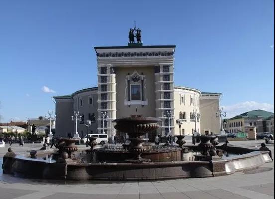 旁邊就是烏蘭烏德的民族劇院,黃色建筑的上方有戰馬嘶鳴的銅像。門口不遠處有展牌,上面是演出預告和海報。