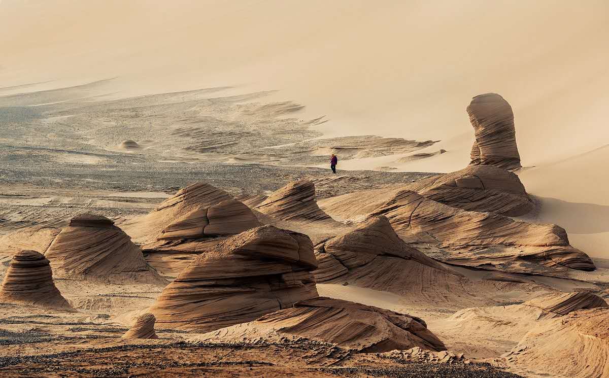 早抵達哈密東站前往游覽電影《無人區》的主要拍攝地【五堡魔鬼城】(車程單程約1.5小時參觀約1.5—2小時),它是風和沙的雕塑藝術,形態各異的土堆屹立在空曠的大沙漠上,土堆渾身上下清晰地記載著歲月洗禮的年輪,傲骨凌風的身軀驕傲地向你講述著生命的意義;
