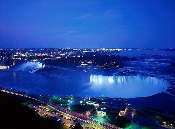 尼亞加拉瀑布在白天看波瀾壯闊,入夜后則是另一番景象。在紅日西墜時(shí),珠幔般的水花,在夕陽(yáng)映照下,七彩虹霓,燦然入目。當(dāng)夜幕降臨之際,瀑布水色漸顯灰黯,此時(shí)圍繞著瀑布周?chē)木扌途酃鉄簦蝗积R放綠光,使原已灰黯的瀑布,頓時(shí)大放光彩,變得晶瑩透澈,熠熠生輝。尤其從塔頂望出去,到處是五顏六色的燈光,瀑布的景象比白天更加多姿多彩。在夏季的每個(gè)星期五,尼亞加拉瀑布上空還有焰火表演。