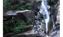 白石山十瀑峽中溪水流淌4000米,穿行于山石之間,十瀑連疊不斷,瀑上有潭,潭泄成瀑,瀑布水花飛濺。飛龍瀑落差48米,瀑面寬3米,如銀河倒掛,聲宏如雷,氣勢雄偉雙龍瀑分兩級跌下,落差60米,落差大。干旱時,水流細,顯的非常秀氣;豐水期,銀簾高懸,景色誘人。連疊不斷的瀑布溪水,在綠色蒼郁的植被襯托下,更顯出生機勃勃,使游人流連忘返。