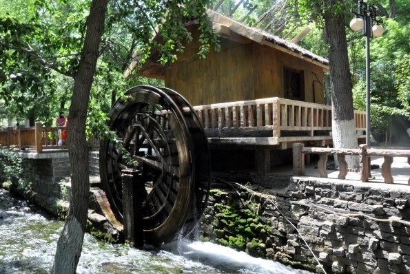 水磨河從龍口泉一直蜿蜒流淌到景區大門,河水清澈,兩岸綠樹成蔭,是整個水磨溝景區最靈動的部分。在靠近龍口泉的河邊,有座水磨坊,這是一座再現歷史景觀的仿古磨坊。據說,清乾隆年間,當地官方和民間曾利用水磨溝的水力,在這里置辦水磨坊一百多間,為駐軍和居民加工食糧,水磨河和水磨溝也正因此得名,后來,隨著磨制工具的更新,原有的水磨坊逐漸絕跡?,F在看到的這座磨坊是1992年的仿古建筑。