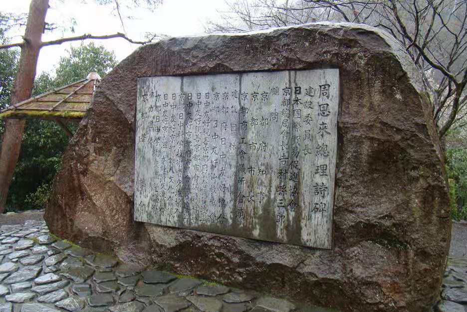 1917年9月,周恩來東渡日本留學。1919年4月在回國途中,他游覽了京都,并撰寫白話詩四首。1979年1月22日,由京都各日中友好團體和知名人士聯合倡議,成立了“周恩來詩碑籌建委員會”。1979年4月16日,詩碑建成。