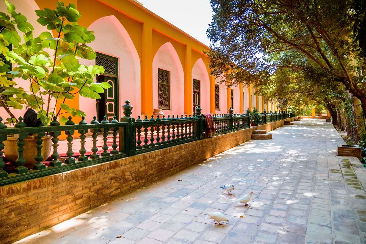 進(jìn)入寺門是一個(gè)八角形穿廳,內(nèi)有一20畝大庭園,南北兩側(cè)各有一排18間的經(jīng)堂,為伊瑪目講經(jīng)和宗教學(xué)生習(xí)經(jīng)之所。園內(nèi)設(shè)有兩個(gè)水池,四周白楊參天,桑榆繁茂,雖居鬧市中心,內(nèi)中卻格外清靜幽雅。