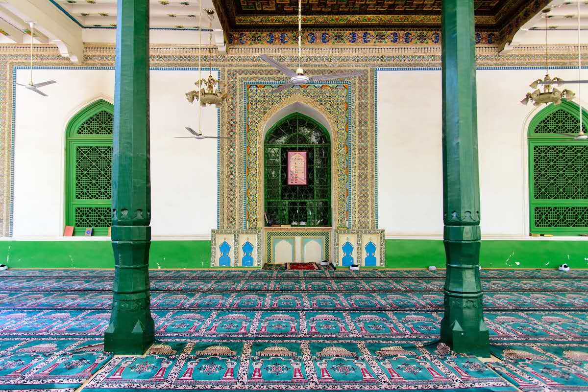 側(cè)門,也是平時(shí)供人們出入之用的。院落的后面有一排木柵欄,柵欄東側(cè),東西走向人行道的南北兩側(cè),有兩個(gè)宣禮塔。塔高6.5米,塔底為長(zhǎng)3米,寬2.2米。柵欄全長(zhǎng)115米,共有5個(gè)木門通向正殿,木柵欄高2.9米,立柱(磚砌)高3.1米,中門高4.1米,兩側(cè)立柱高5.2米。版權(quán)所有山東聊城聊之旅國(guó)際旅行社有限公司,轉(zhuǎn)載必究!從柵欄的五個(gè)門進(jìn)入禮拜殿,有五個(gè)臺(tái)階可以上到禮拜殿,禮拜殿分為正殿和外殿,長(zhǎng)140米,寬16米,加上向西突出的前廊部分,禮拜殿共2600平米,從中間的八級(jí)臺(tái)階可直上正殿的前廊。正殿長(zhǎng)36.5米,寬10.5米,高8.1米。寺內(nèi)平時(shí)有二、三千人做禮拜,“居瑪日”(星期五)有六七千人;逢節(jié)日時(shí)在寺內(nèi)外跪拜的穆斯林可達(dá)二三萬(wàn)人之多。
