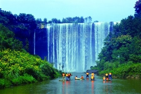 竹筏穿瀑云霧溫卷,彩虹生輝,在陽光的照射下,瀑霧處處成虹。隨陽光強弱,觀賞角度的變化而變化。游客乘坐竹船漂流于湖面之上,觀瀑觀景便能達到只身如畫不是夢的境界。
