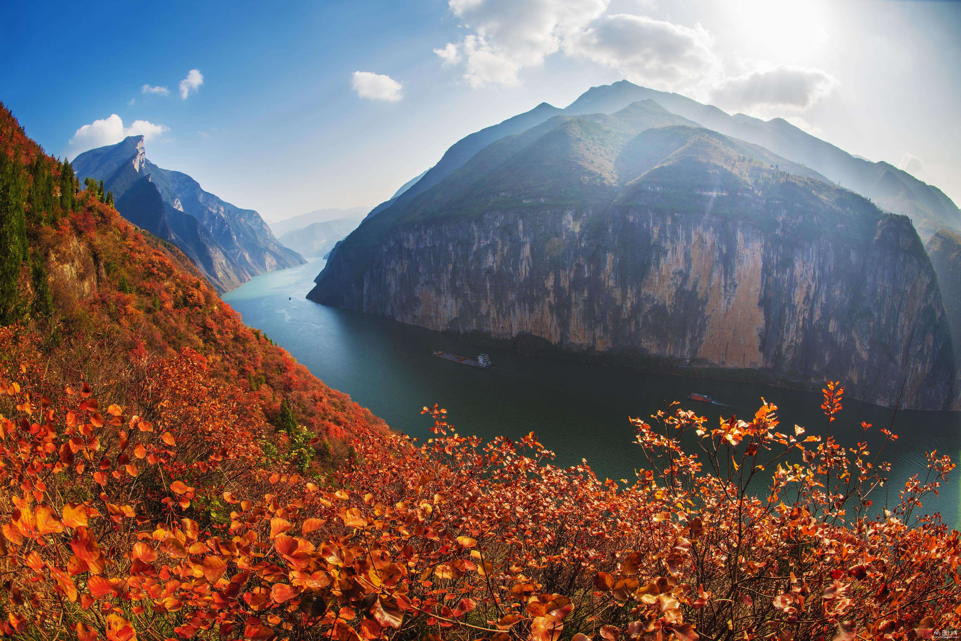 奔騰咆哮的長江,一進峽谷便遇上氣勢赫赫的夔門。夔門兩岸的 山峰,陡削如壁,拔地而起,把滔滔大江逼成一條細帶,蜿蜒于深谷之中。這里河寬只有一、二百米,最窄處不過幾十米;而兩岸主要山峰可高達1000-1500米。這里峽深水急的江流,綿延不斷的山巒,構成了一幅極為壯麗的畫卷。正如郭沫若《過瞿塘峽》一詩所云:“若言風景異,三峽此為魁”。