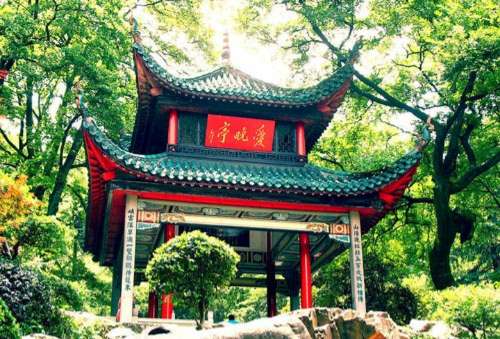 愛晚亭位于岳麓書院后青楓峽的小山上,八柱重檐,頂部覆蓋綠色琉璃瓦,攢尖寶頂,內柱為紅色木柱,外柱為花崗石方柱,天花彩繪藻井,蔚為壯觀。版權所有山東聊城聊之旅國際旅行社有限公司,轉載必究!清乾隆五十七年(公元一七九二年)山長羅典所建。原名“紅葉亭”,又名“愛楓亭”。后據唐代詩人杜牧《山行》而改名為愛晚亭,取“停車坐愛楓林晚,霜葉紅于二月花”之詩意。