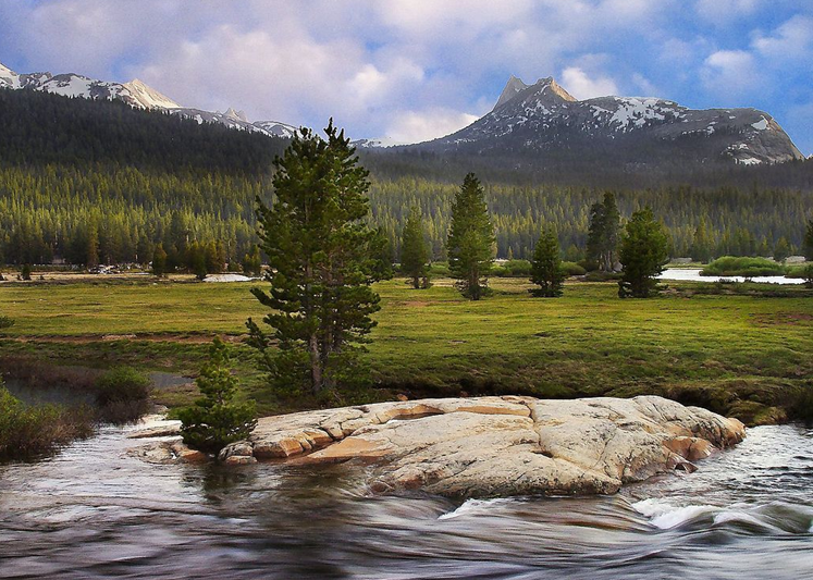 約塞米蒂國家公園的溪流是世界上最著名、最有趣的溪流,它們吸引著一批又一批慕名而來的旅游者,穿行在妙趣橫生的峽谷中,年復(fù)一年,樂此不疲。較大的溪水與河流以其桀驁不馴的能量在峽谷間展現(xiàn)著它們的清澈與秀美。在泡沫飛濺的寬闊的平地上,水流以平緩的斜度呈梯極傾瀉而下,隨處泛起美麗的旋渦,四濺的水霧在陽光中幻出彩虹;在沖過崎嶇的峽谷與擋在河道上的巨石時(shí),水石相擊的轟鳴久久回蕩。在瀑布上,水勢洶涌、奔放豪邁,而在穿過綠蔭掩映的長長的森林流域時(shí),水流卻變得平緩舒暢,水光如銀、水聲如訴,使大峽谷中充滿了美妙的歌聲,使萬物充滿了生機(jī)。