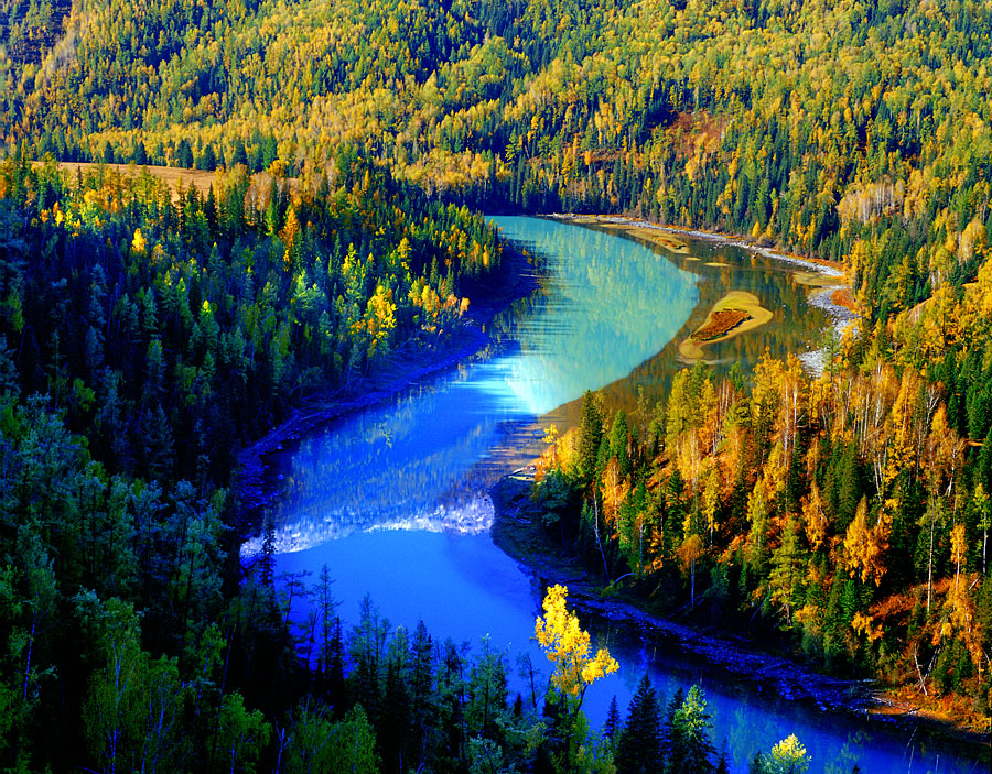 深秋時(shí)節(jié)是月亮灣色彩最豐富景色最迷人的時(shí)候。山頂?shù)难┖涂~緲的霧是白色,山腰的西伯利亞落葉松和白樺樹的葉是金黃色,間雜其中的冷杉和云杉翠綠色,河水是翡翠色,九月底的月亮灣還有楓樹的紅葉映襯,簡(jiǎn)直就是上帝的調(diào)色板。