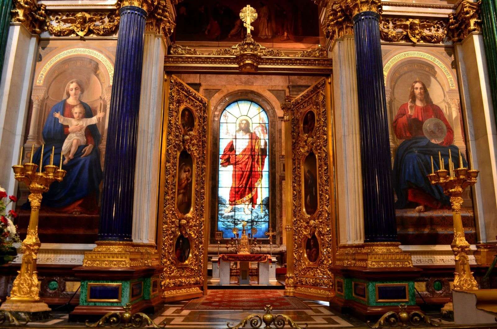 教堂內(nèi)部使用有色大理石、孔雀石、青金石等進(jìn)行裝飾。使用鑲嵌畫手法繪成的圣像中,大部分都是珍品,在中央圓頂下的卡爾·布留洛夫的作品《玉座上的圣母瑪利亞》是最值得一觀的,而裝飾教堂的300多幅浮雕和雕像個(gè)個(gè)精致無比。