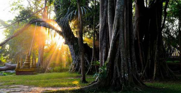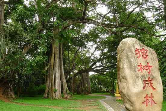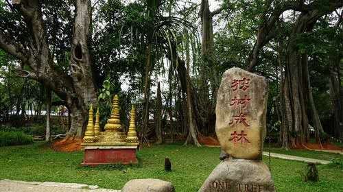 獨樹成林位于打洛鎮邊境貿易區內的曼掌寨子旁,距離打洛鎮政府以南3.5公里,靠近中緬邊境的地方。這是一棵古榕樹,有900多年的樹齡,共有34個根立于地面,樹高50多米,樹幅面積2000多平方米,枝葉既像一道籬笆,又像一道綠色的屏障,成為熱帶雨林中的一大奇觀,打破了“單絲不成線,獨樹不成林”的俗語。