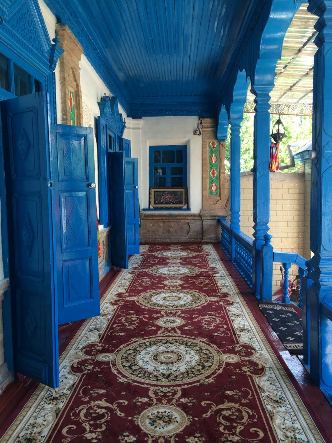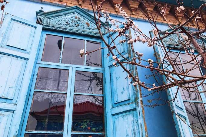 這里的民居與環境始終保持著較為完整的傳統風貌與格局,頗具中西亞特色及“塔蘭奇”傳統文化風格。喀贊其的房屋建筑對藍色的使用頻率非常高,或者在外墻,或者在屋頂,更多時候是在門板和窗欞,藍色大都是主色調,整個建筑顯得精致而純凈。