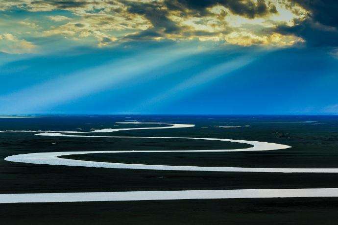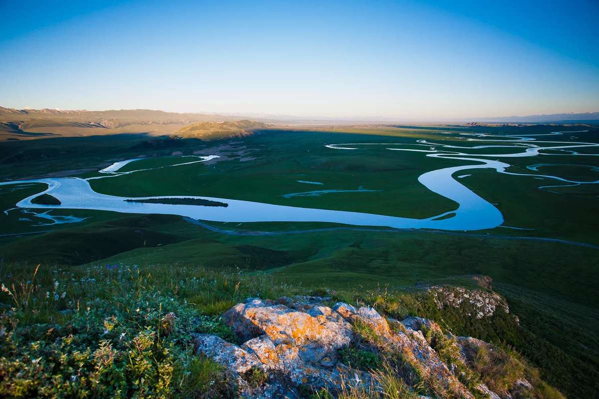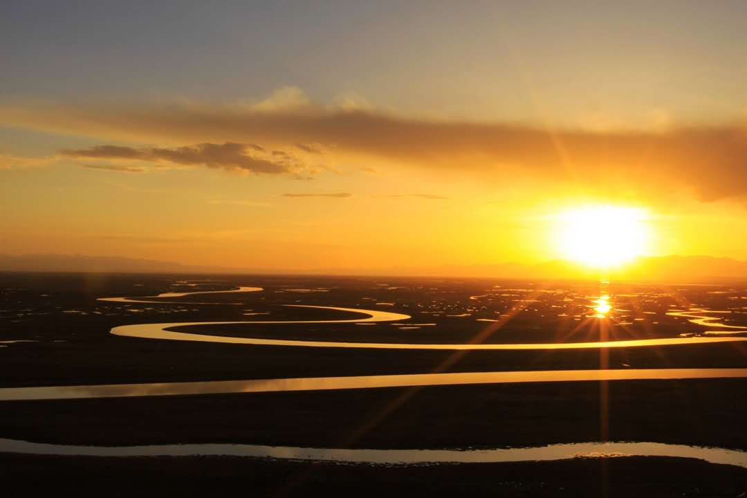 開都河的源頭云霧繚繞,特別是盛夏,云涯水暖,云水難辨,仿佛河水從天而降。開都河上游河流由小尤勒都斯盆地,經(jīng)過巴音布魯克,到大尤勒都斯盆地,水流平緩,河谷開闊,四周牧草豐茂,是天然的優(yōu)良牧場。特別是在小尤勒都斯盆地平坦遼闊的草原上,開都河蜿蜒流淌,形成九曲十八彎的壯麗景象。那模樣,像一個(gè)大寫的蒙古文字,有一種鬼斧神工的靈氣。