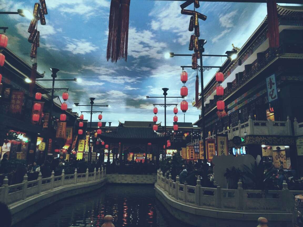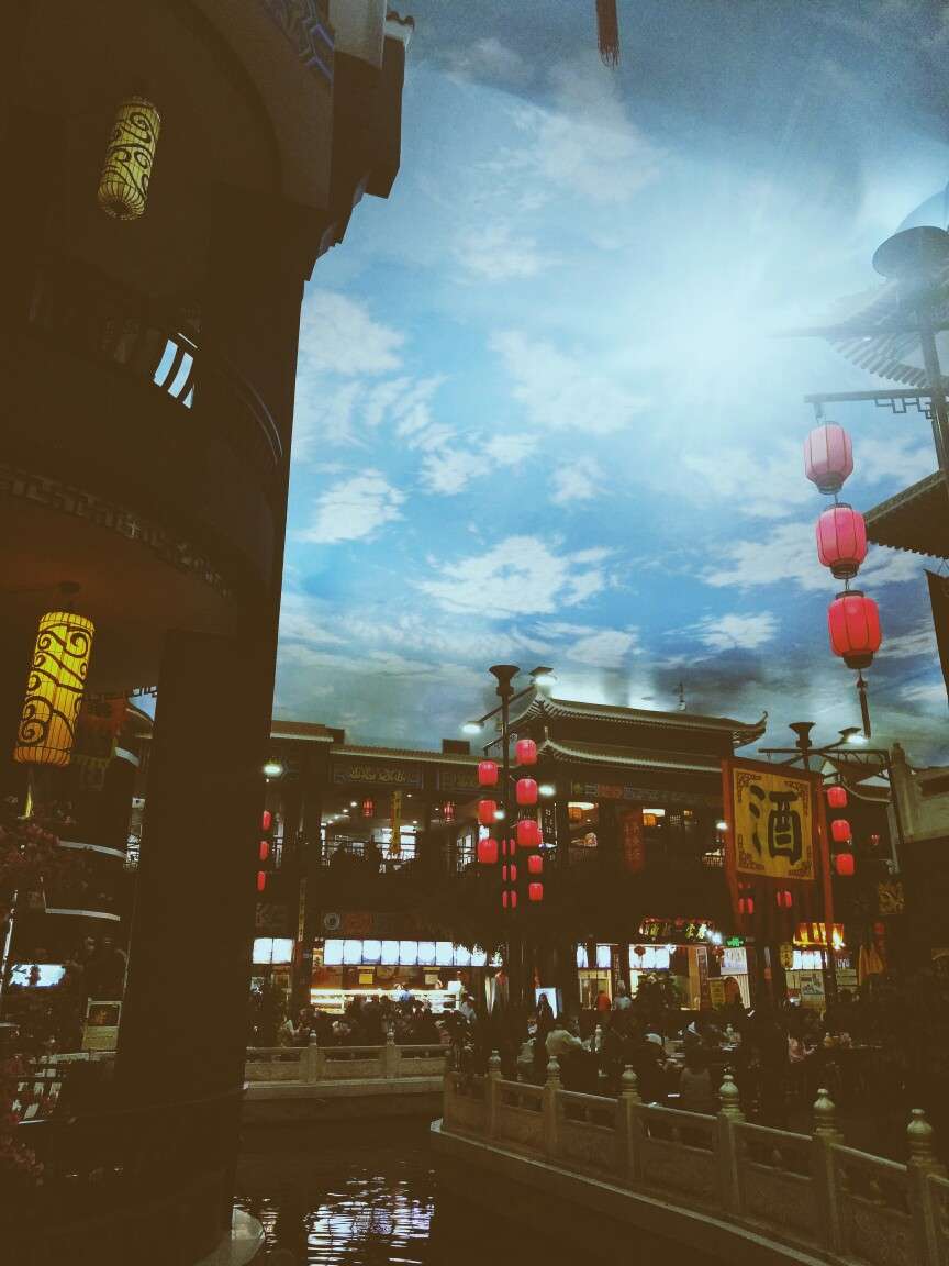 抬起頭,房頂噴繪的藍(lán)天白云,加上周圍小吃攤販身上的古裝,制作木板年畫(huà)的老師傅縱橫的皺紋,以及路邊一排繡娘手中的銀針,讓來(lái)者一時(shí)忘憂。