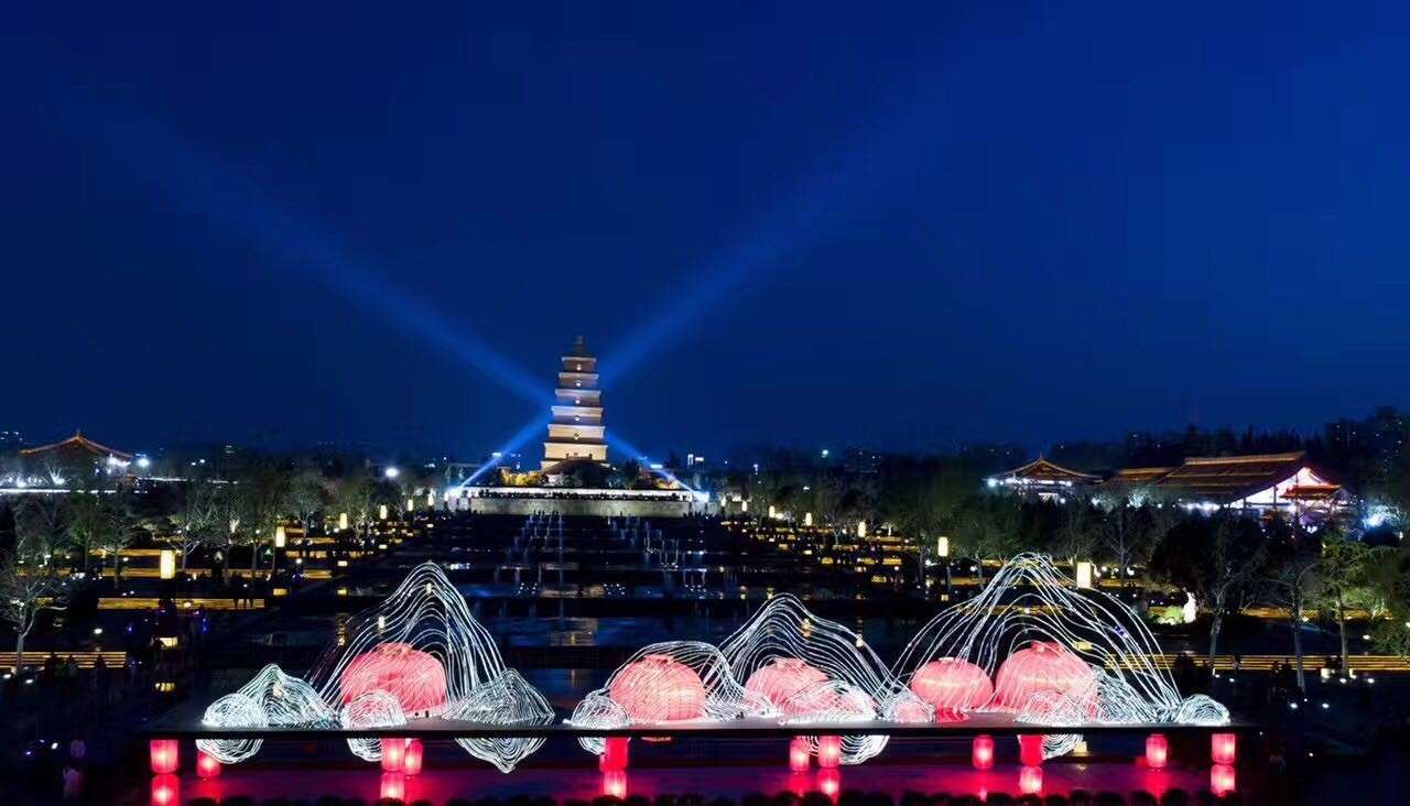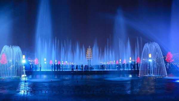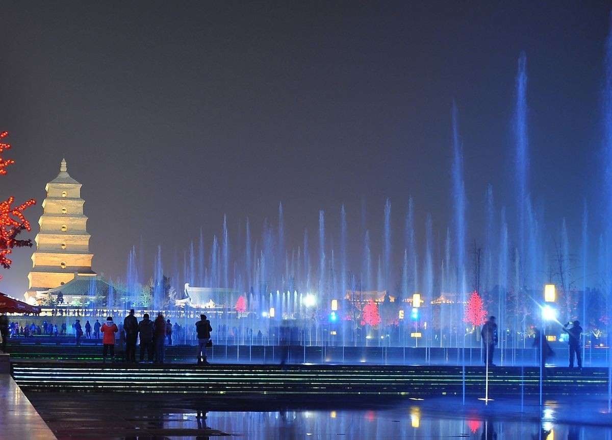 西安大雁塔北廣場是一個規模宏大的音樂噴泉廣場東西寬218米南北長346米是目前全國乃至亞洲最大的噴泉廣場。噴泉和附屬土建資金投入約5億元在全國首屈一指;其八級疊水池中的八級變頻方陣是世界最大的方陣。這套噴泉共設計獨立水型22種其變頻方陣(排山倒海水型)蓮花朵朵;百米變頻跑泉云海茫茫;海鷗展翅、蝶戀花、水火霧以及60米高噴水柱等都是我國最新推出的科技含量較高的新穎水型;60米寬、20余米高的大型激光水幕中4臺噴火火泉從水里噴出在6米高空充分燃燒低溫爆開更增加了整個噴泉的奪人氣魄。音樂采用高保真遠射程專業音響系統使噴泉聲、光、水、色有機交融。