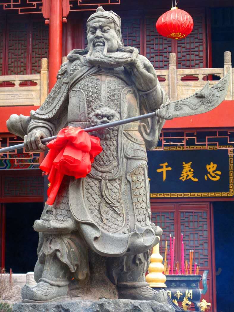 9、廣場關公立姿石像 誠信殿旁,花崗巖雕塑的關公立姿像,高4.8米,關公面朝東方,握刀遠眺,威儀凜然,似乎在訴說“我回來了”!