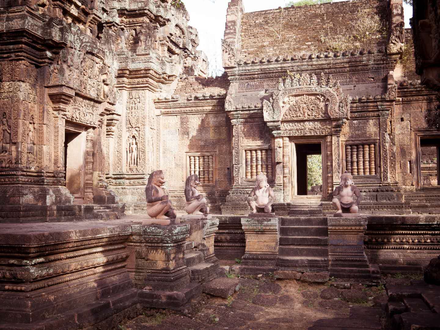 很多人認為女王宮是吳哥藝術王冠上一顆璀璨的明珠。第一眼你可能會因其規模而感到失望,然而一旦身處其間,你就不能不為裝飾其門廊和墻壁的精美雕刻深深打動。版權所有山東聊城聊之旅國際旅行社有限公司,轉載必究!這些雕刻都圍上了繩索。女王宮在暹粒以北32公里處,最好在接近傍晚時分或者清晨(旅游公共汽車到達之前)去參觀,因為這時的太陽光線會使粉紅的沙石獲得最佳效果。