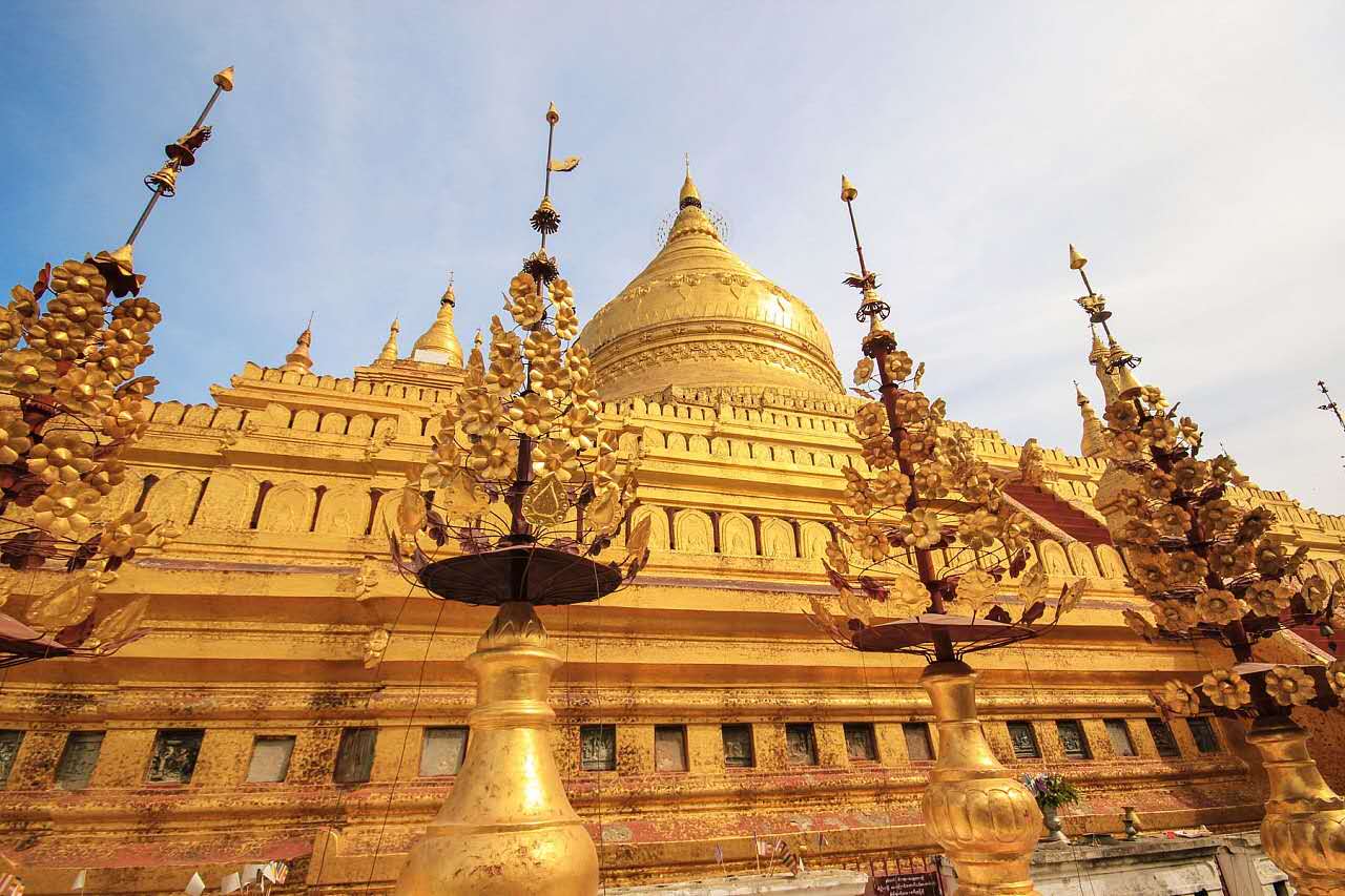 公元1059年,蒲甘王朝的阿奴律陀主持修建了瑞喜宮佛塔,當時的瑞喜宮佛塔作為皇家佛塔修建。當時,塔內供應佛的前額骨和佛齒。可惜的是阿奴律陀最后沒能看到佛塔的完工,他的兒子江喜陀王繼位后,繼續修建佛塔。版權所有山東聊城聊之旅國際旅行社有限公司,轉載必究!佛塔終于在公元1090年竣工。整座塔呈現了金鐘形,底座呈八角型,有三層四方形的塔基。整座佛塔精美絕倫,細致的雕刻和優美的造型呈現出一種難以用言語表達的美感。在入口處立著獅子像,和瑞喜宮佛塔塔身一樣一樣,全身金光閃閃。
