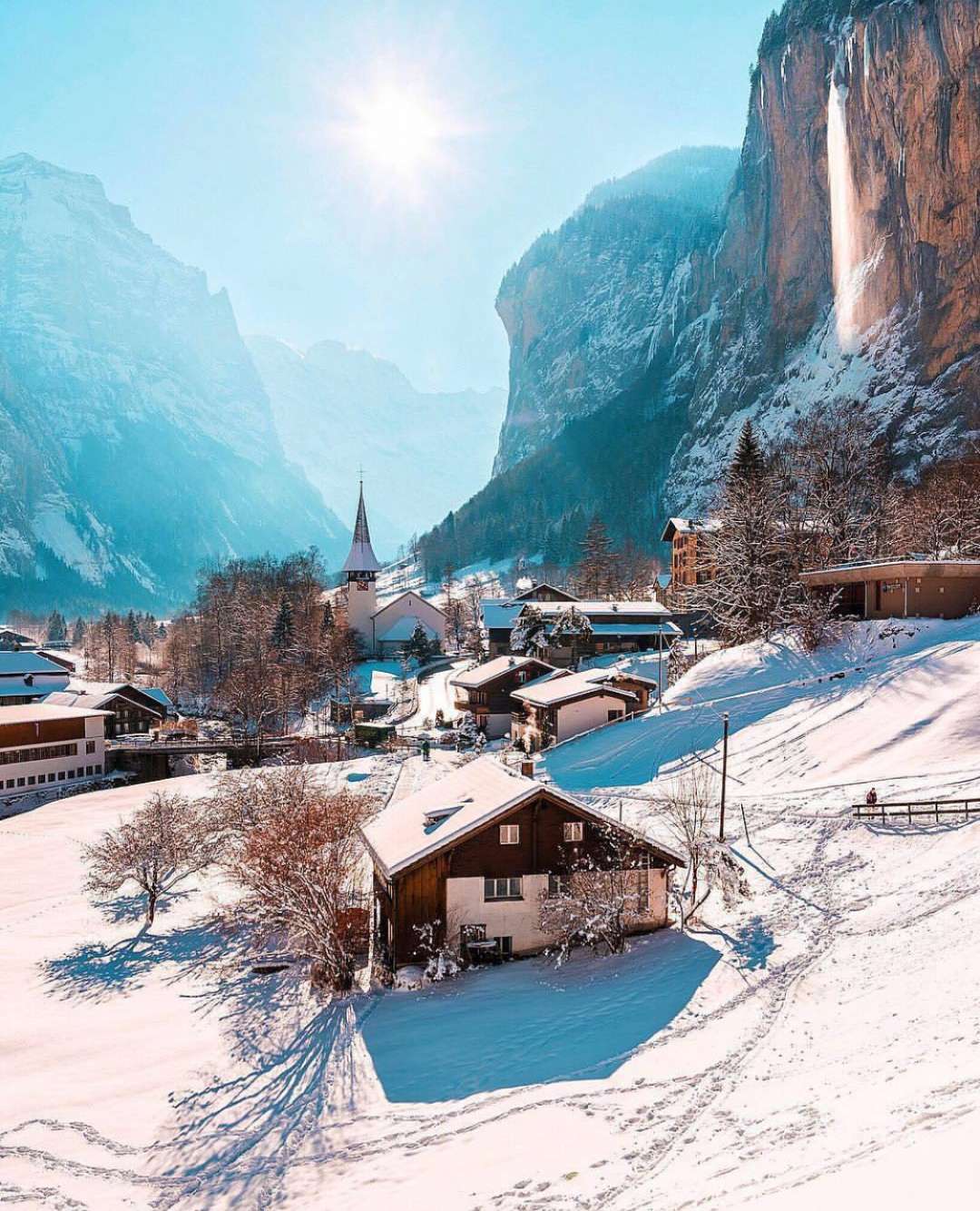 英特拉根市西面是圖恩湖,東面是布里恩茨湖。兩湖都為狹長形,略向北翹,加在一起像一彎中間斷開的新月。其中圖恩湖面積較大,但湖水不深,游人可乘船暢游,也可驅車或搭火車沿湖觀光。玲瓏的村莊或高棲坡崗,或依立水邊,裝點著大自然的妖媚。