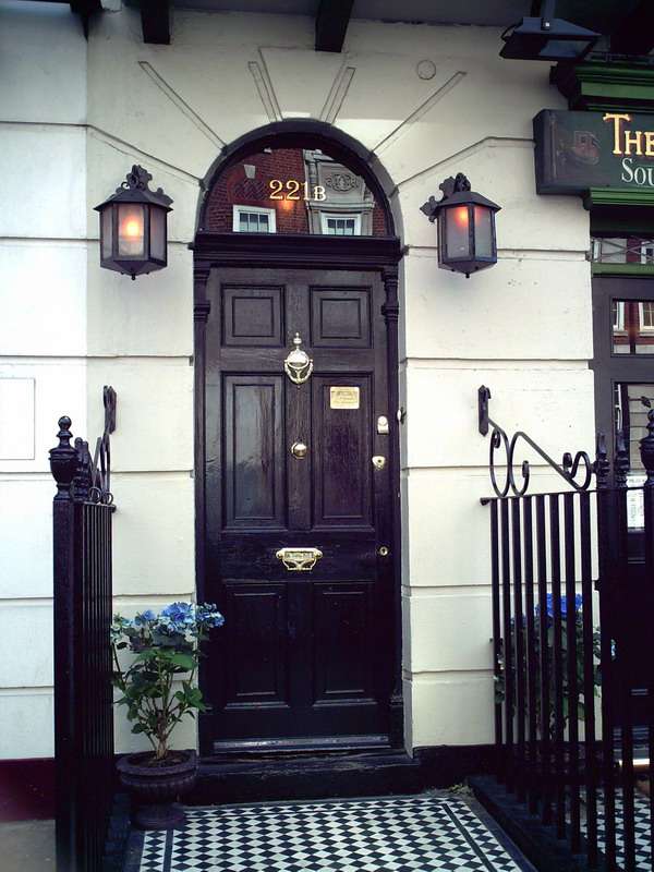 說起貝克街、福爾摩斯他們所居住的221b是很有名的、但當(dāng)時(shí)貝克街是從東側(cè)從南到北有1號(hào)~42號(hào)、西側(cè)由北到南是44號(hào)~85號(hào)。并不存在221號(hào)。也就是說221b只是作者制造出來的虛幻的地方。順便說一下、221b的“b”并不是英文字母“b”,而是法語中的bis(~2)的意思、221地址是表示有2戶人家的記號(hào)。當(dāng)前的貝克街221b是金融公司(ABBY NATIONAL)、鄰接的場(chǎng)所建有夏洛克·福爾摩斯的住所。