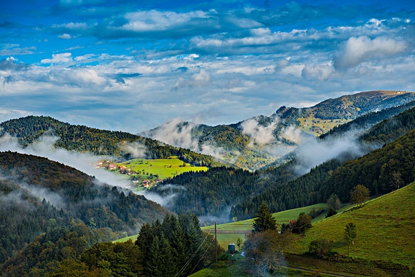 南部黑森林,從弗賴堡到德國和瑞士的邊境。樹林不再相連成一大片,風(fēng)光逐漸接近瑞士,山間的草地逐漸增多,樹林間的山坡被開辟成草地牧場(chǎng)。