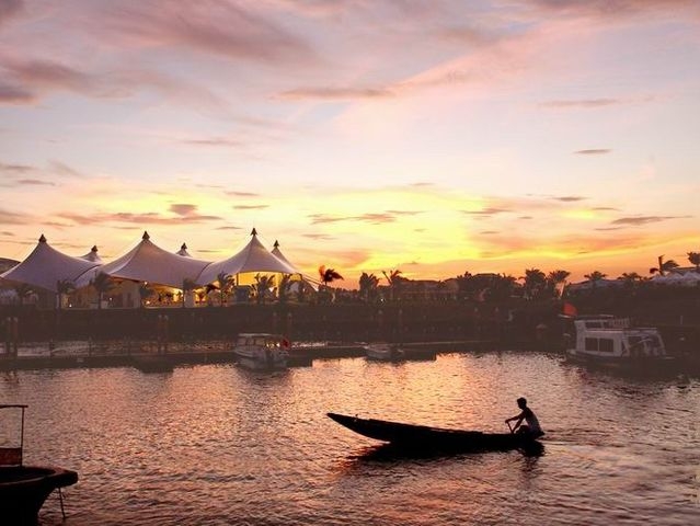 博鰲亞洲論壇會址建在三河出海口的西南岸邊,由五個巨大白色帳篷組成,遠眺似天空飄浮的五朵白云;東面是三河出海口的腹部,前面寬闊的港灣和沙白如銀的玉沙帶;西面和南北面系博鰲水城,別墅星羅棋布。夜晚,萬盞彩燈競亮,猶如天上人間。