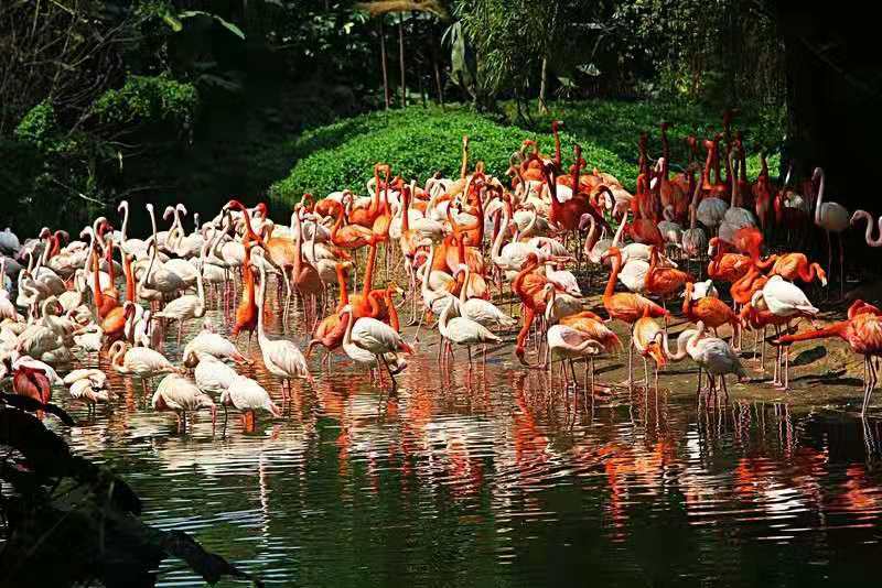 亞馬遜雨林位于南門入口,這里有一片霧氣彌漫的雨林中心,這里正是成百只火烈鳥的家,火紅的火烈鳥把綠意盎然的島變成了火燒島,熱鬧而聒噪的火烈鳥叫聲顯示出這片雨林無限的活力。游客可以選擇環湖綠道或者熱帶雨林小道兩條路線進行參觀:綠道可以欣賞雨林全貌,而小道也是觀景也是別有風味,可以沿途觀賞多種珍稀植物。行走于熱帶雨林小道深入到雨林區的核心,為了模擬雨林的濕氣和生態,沿途安裝了高科技噴霧裝置,即使在炎炎夏日,行走在雨林小道,仿佛如行走在真正的熱帶雨林一般涼爽濕潤。