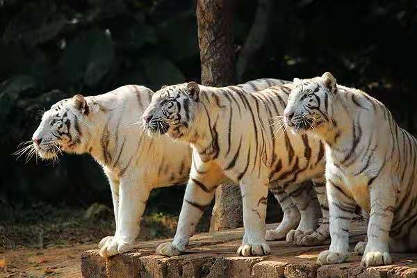 白虎是長隆野生動物世界的鎮園之寶,也是長隆集團的吉祥物。目前長隆野生動物世界已經擁有超過150多只白虎,是世界上白虎最多的園區,被稱為世界白虎王國也當之無愧。除了白虎,還有華南虎、金虎、銀虎以及孟加拉虎和東北虎等六大虎種多達300多只老虎生活在長隆野生動物世界。生態虎園在生活區域住著金虎、白虎、銀虎、孟加拉虎、華南虎以及東北虎等,每個虎種有自己的單獨生活區域,生活區內巨石假山,流水潺潺,百分百的模擬老虎的野外生活環境。根據老虎生活習性的不同,加以細微的變化,比如華南虎和東北虎的體型和生活環境都有巨大的不同,所以在場館的設計建設上,也根據這些差異做到“虎”性化“虎”居,讓老虎們安居長隆野生動物世界。在金虎山則可以目睹世界罕見的金虎、銀虎。