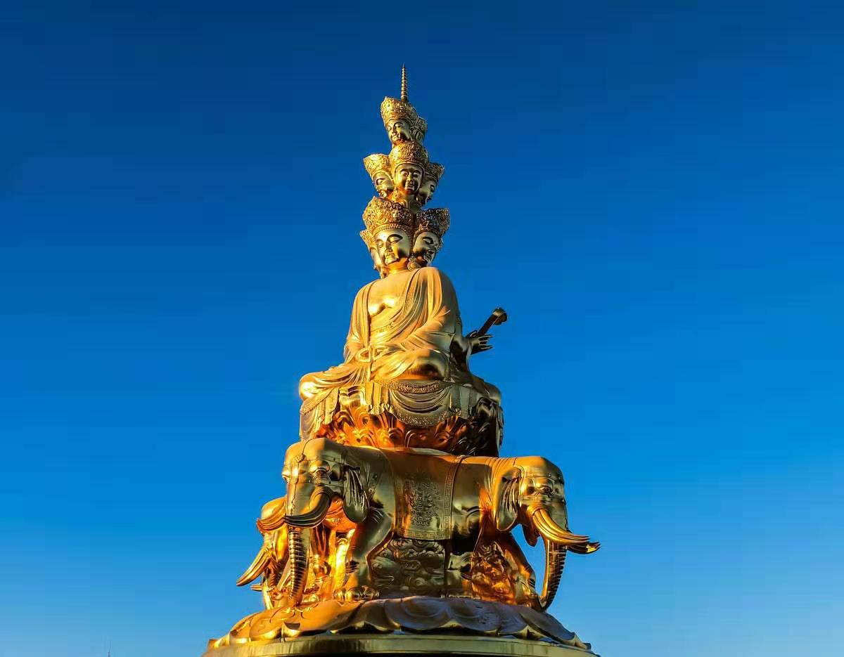 金頂最高處,有一座稀有珍品,稱作“金頂銅殿”,為明萬歷三十年(1602年)妙峰禪師請西蜀藩王潞安捐造的。殿高8米,寬4.8米,深4.3米,上為重檐雕甍,環以繡棕鎖窗,通體皆用銅件焊成。版權所有山東聊城聊之旅國際旅行社有限公司,轉載必究!屋頂檐瓦餾金,在陽光映照之下,金光閃閃,迢耀百里,固名金頂。銅殿內置普賢騎象銅像,高5米多,兩旁陳列24尊銅佛,現規模僅次于萬年寺。門枋陰刻“云棧劍閣”和“峨眉山道全圖”,四周銅壁上刻有經文和佛像萬尊。在銅殿外還樹有銅塔和銅碑。有趣的是,一般寺廟的大門都是朝南的,唯獨峨眉山的都朝東,金頂的銅殿,卻又例外的朝西,這也可算是峨眉山的獨特之處了。據說從前西藏來的信徒只禮拜金頂,因為釋迦牟尼的故鄉在西域。該殿不幸在清代燒毀。