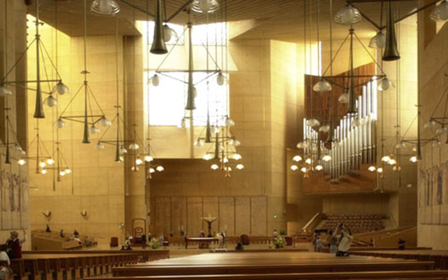 教堂占地二千余平方尺,頂部為鐘樓。禮堂高大寬敞,可容二百多教友同時參加儀式;圣壇上置圣母像,據(jù)說是從歐洲運來;其兩側(cè)有數(shù)尺高的天使像,造型栩栩如生,是為紀(jì)念建堂百周年而置。