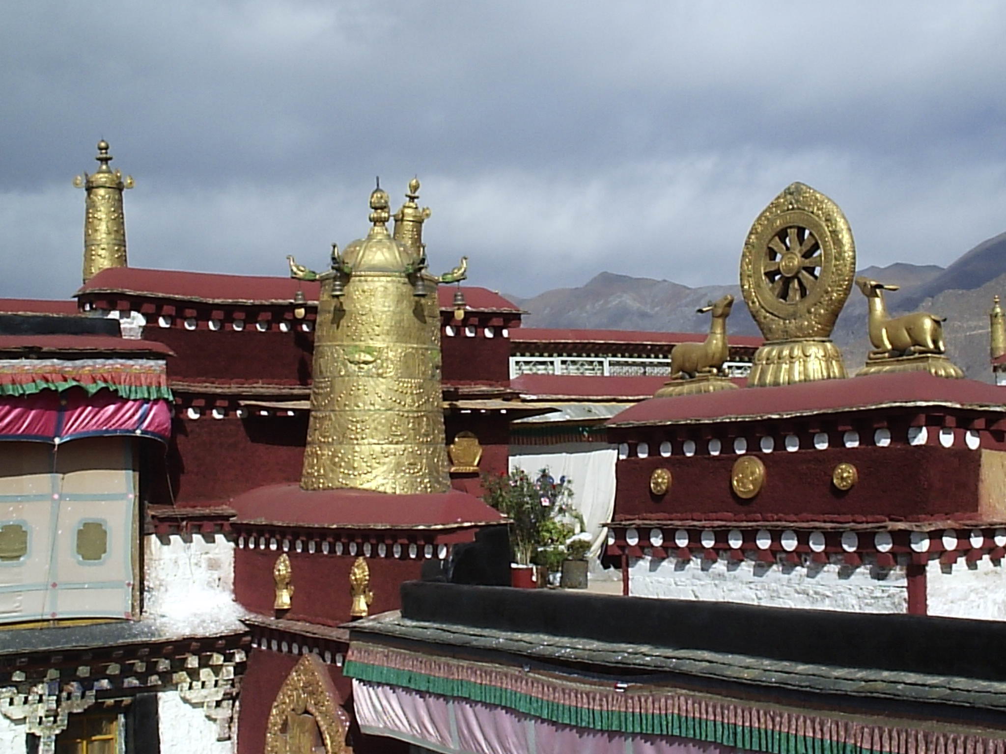 從大昭寺金頂俯瞰大昭寺廣場,右邊遠處山上是布達拉宮,近處的柳樹是“公主柳”,相傳是文成公主所栽。大昭寺的布局方位與漢地佛教的寺院不同,其主殿是坐東面西的。主殿高四層,兩側列有配殿,布局結構上再現了佛教中曼陀羅壇城的宇宙理想模式。寺院內的佛殿主要有釋迦牟尼殿、宗喀巴大師殿、松贊干布殿、班旦拉姆殿(格魯派的護法神)、神羊熱姆杰姆殿、藏王殿等等。寺內各種木雕、壁畫精美絕倫,空氣中彌漫著酥油香氣,藏民們神情虔誠地參拜轉經。