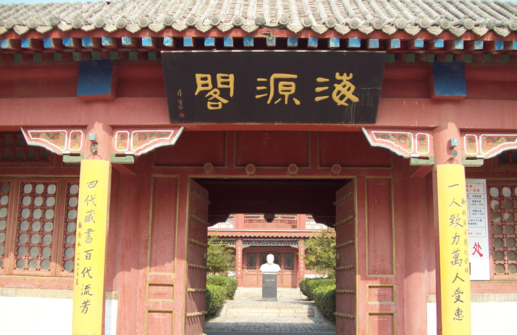 現(xiàn)在的海源閣藏書樓,是1992年10月重新修復(fù)的。大門兩側(cè)的楹聯(lián)是胡喬木同志題寫的。上聯(lián)“一人致力萬人受惠”,下聯(lián)“四代藏書百代流芳”。“海源閣”三個字是由山東大學(xué)教授、著名書法家蔣維崧題寫的。