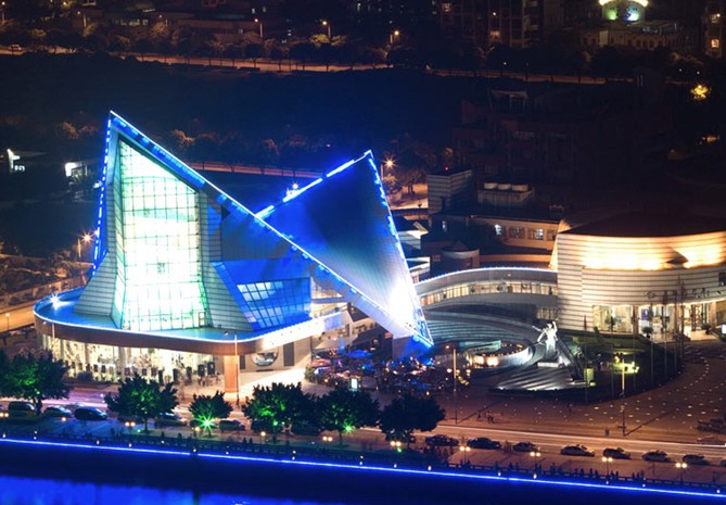 星海音樂廳位于廣州二沙島,造型奇特的外觀,富于現代感,尤如江邊欲飛的一只天鵝,與藍天碧水渾然一體,形成一道瑰麗的風景線。這座以人民音樂家冼星海的名字命名的音樂廳,占地1.4萬平方米,建筑面積1. 8萬平方米,設有1500座位的交響樂演奏大廳、460座位的室內樂演奏廳,100 座位的視聽欣賞室,和4800平方米的音樂文化廣場。整體建筑為雙曲拋物面鋼筋混凝土殼體,室內不吊天花板,做到建筑空間與聲學空間融為一體。星海音樂廳總投資達2.5億元,是我國目前規模最大,設備最先進,功能完備,具有國際水平的音樂廳。