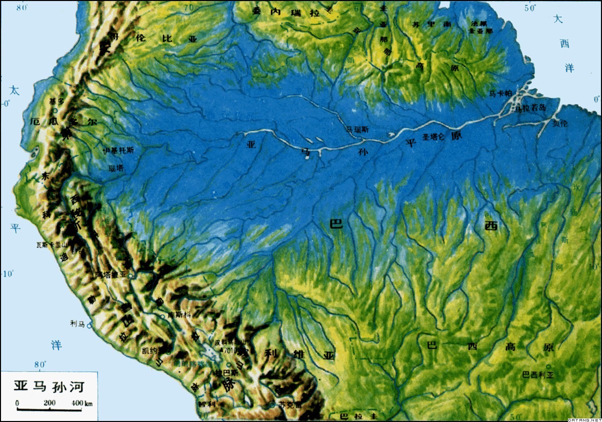 亞馬遜河流域西高東低,南高北低。上游源頭為安第斯山脈及太平洋沿海沖積系統(tǒng),海 拔在3000m以上;干流兩岸多為200m以下的安第斯山?jīng)_積層和內(nèi)陸沖積層。往北為圭亞那高原(海拔300~400m),往南則為巴西高原(海拔300~1500m)。