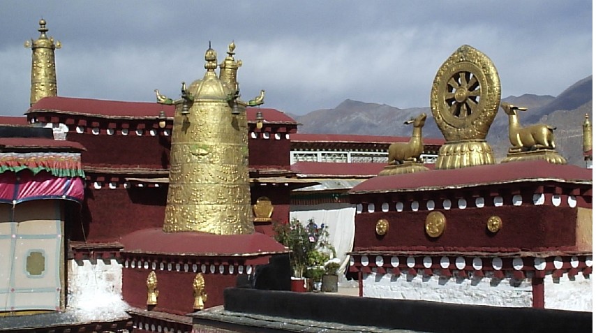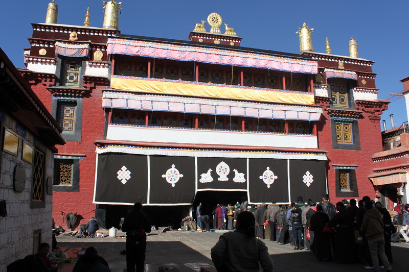 凈室門口兩側還供有四大天王泥塑像。最后部是佛殿,內2柱,無柱礎,面積23。5平方米。大柱表面用麻繩纏繞之后又用2~3厘米的泥皮涂抹,可能是防腐、防火的措施。柱頭雕有蓮花寶座,柱頭小栱上則無裝飾,具有明顯的早期特點。四壁的壁畫多為線描盤腿坐形象,筆法流暢生動。大殿的墻壁均用大石塊夾小石片砌成,厚1~1。3米。殿內供有尼泊爾墀尊公主帶來的銅鎏金不動金剛佛和八大隨佛弟子泥塑像,以及兩大忿怒力士、宗喀巴塑像。佛殿后部和兩側還繞以密閉回廓,偏窄、較高,具有早期布局特征。神殿第二層前前為僧舍,中部為大經堂天井,天井之后為供佛大殿,6柱,內供桑杰魯王甲后、十六尊者及經書;里面還有一大殿,8柱,內供藥師八如來和《甘珠爾》佛典,北面供奉有救度母及其他佛像。神殿第三層前面為達賴喇嘛到該寺的專用住房,共6間。后部則為金頂殿,殿門向東,面積約54。5平方米,內有明柱兩排8根,左右開小窗。殿左右及后部有一周狹窄回廓,以木欄相圍。金頂為漢式風格,屬歇山式,以斗栱承托;金頂垂脊末端套有羯摩魚頭,是為套獸。殿內門窗壁畫、柱子等則是藏式風格,體現了藏漢建筑的巧妙結合。