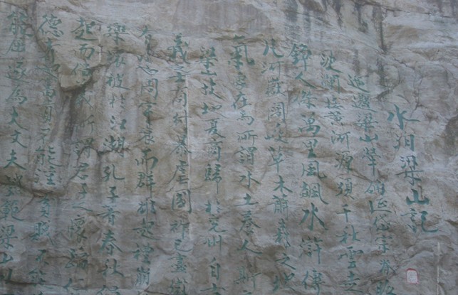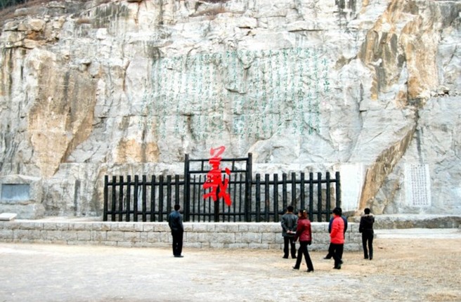 《水泊梁山記》是著名書畫大師范曾2002年專為水泊梁山風(fēng)景區(qū)撰寫。先生懷著對英雄故里的一腔深情,慷慨揮毫、步其先人范仲淹《岳陽樓記》韻,全文368字,描述了水泊梁山河岳闊峻、草木蕭森的雄奇景象。《水泊梁山記》大型摩崖石刻,通高7米、長14米,距地面10余米,單字最大55厘米見方,最小字30厘米見方,通篇368字占地近100平方米,氣勢恢弘、蔚為大觀,形成了南有《岳陽樓記》、北有《水泊梁山記》的文化格局。為旅游勝地水泊梁山再添景觀,現(xiàn)為水泊梁山風(fēng)景區(qū)的主要景點之一。與梁山粗獷豪放的山體及周圍環(huán)境交融,深化了景區(qū)的水滸文化內(nèi)涵,成為進入梁山風(fēng)景區(qū)山寨景區(qū)的標(biāo)志性景觀,其所在廣場,亦成為在梁山舉行的與水滸、旅游有關(guān)的大型集會的場所之一。