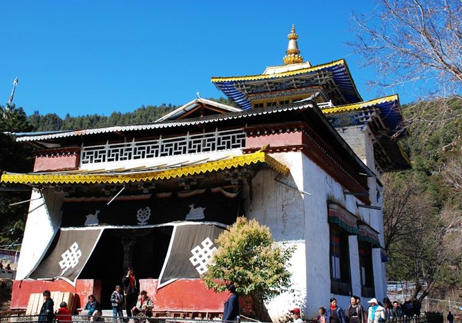 布久喇嘛林寺位于尼洋河下游左岸的三級階地上,三面環山,面對尼洋河口三角洲,屬紅教寺院。整座寺廟為土木結構,飛檐畫棟,版權所有山東聊城聊之旅國際旅行社有限公司,轉載必究!金碧輝煌,融合藏漢民族不同建筑藝術風格。寺院周圍的環境清幽,綠樹成蔭,寺院外清溪長流。置身此間,既可觀賞漫山林海,又可遠眺波光瀲滟的尼洋河三角洲。