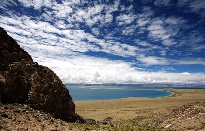 當惹雍措是藏北著名神湖,它位于那曲地區的一個深陷的湖盆底部,它與當惹雍措相毗鄰。當惹雍措湖面形似一金剛杵,上圓中細下部長,四面群山環抱,南面的達爾果山山頂積雪終年不化。實際上當窮措與當惹雍措是在同一個湖盆之內,湖水未枯以前本是同一湖泊。這正是當窮措名字的來歷,藏語里當窮措即小的當惹雍措之意。據說此湖在一天之中能變換三種顏色。湖東岸是連綿不斷、屏風般矗立的褚紅色山壁,它們清晰地記錄了當惹雍措湖水一次次下降的歷史。被湖水沖刷而成的階梯從湖畔山頂一圈又一圈地一直環繞到湖濱。