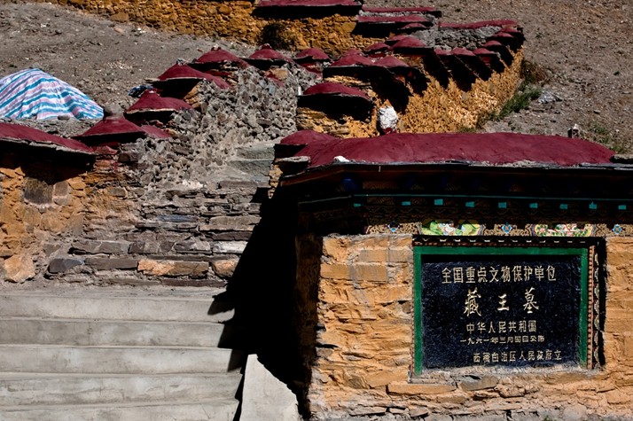 藏王墓屬全國重點文物保護單位,位于山南窮結縣宗山的西南方,背靠丕惹山(意為增長之山),是吐蕃王朝時期第29代贊普至第40代(末代)贊普、大臣及王妃的墓葬群,總面積385平方米。各陵墓封土高大,為土壘成的高臺丘墓。其上層土墩為橢圓形,墩頂極平坦,東西長約130米;下層為長方形土臺,周邊不齊整。藏王墓的數目現難確定,能看到的有八九座。靠近河邊的大墓據說是松贊干布之墓,與之相鄰的是赤松德贊的墓,墓旁有巨大功德碑。在9世紀中后發生的奴隸起義中,贊普陵墓全被搗毀,現在的藏王墓只是衣冠冢而已。