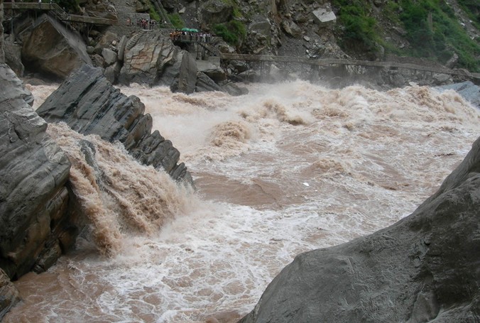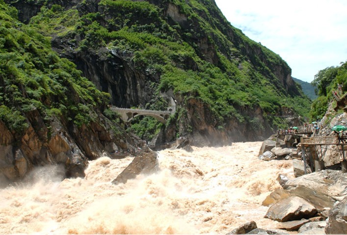石鼓以下,江面漸窄,至左岸支流碩多崗河口橋頭鎮(zhèn),往東北不遠(yuǎn)即進入舉世罕見的虎跳峽。虎跳峽上峽口與下峽口相距僅16公里,落差竟達220米。平均坡降達13.8‰,是金沙江落差最集中的河段。峽中水面寬處60米,窄處僅30米并有巨石兀立江中,相傳曾有猛虎在此躍江而過,故名虎跳石,虎跳峽也由此得名。峽內(nèi)急流飛瀉、驚濤轟鳴,最大流速達10米/秒。峽谷右岸為海拔5596米的玉龍雪山,左岸為海拔5396米的哈巴雪山,兩山終年積雪不化。峽內(nèi)江面不足海拔1800米,峰谷間高差達3000余米。峽中谷坡陡峭,懸崖壁立,呈幼年期“V”型峽谷地貌。