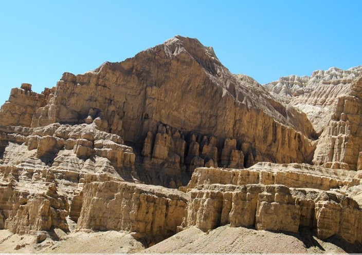 扎達土林面積達數(shù)百公里之闊,其地貌在地質(zhì)學上稱河湖相。專家考證,一百多萬年前,扎達到普蘭之間是個方圓500多公里的大湖,喜馬拉雅造山運動使湖盆升高,水位線遞減,逐漸沖磨出“建筑物”惟妙惟肖的形狀與層高,數(shù)十萬年風雨的侵蝕,猶如神工鬼斧不間斷的雕琢打磨,更使他玲瓏剔透出神入化。