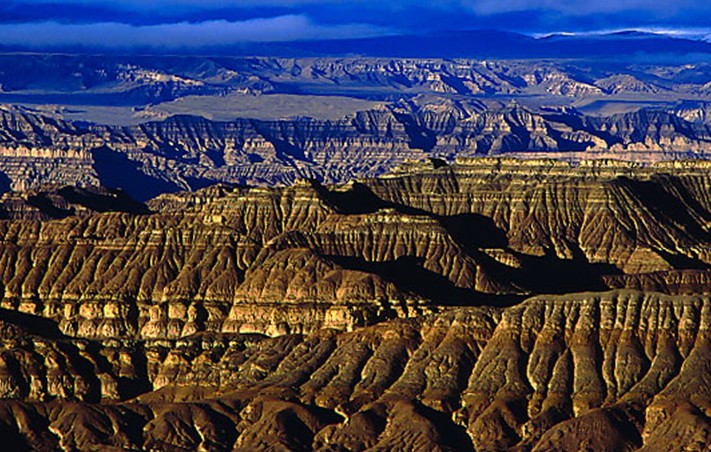 立于盆地之中,旅者可以深深體會到大自然的偉力,更為它的造化所震撼。這扎達盆地里獨特的自然地貌、這地球上規(guī)模最大的一片土林;峽谷與土林層層疊疊,綿延不絕。這是一種獨特的“水平巖層地貌”,是高平的山頂被縱向切割侵蝕成的一條條深深的溝壑,變成了土的林海,但人們更愿意相信,這是一種藝術(shù),一種大地的藝術(shù),就好像是大自然特意造出來、專門是為了向人類展示其魅力似的。這就不難理解為什么那么多的各學科的科學工作者——包括人文工作者——都迷戀著扎達的土林。