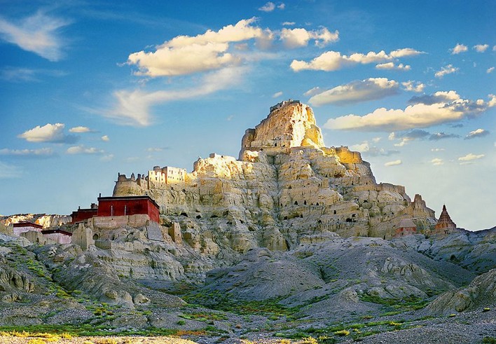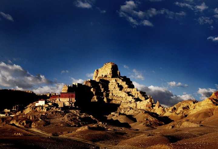 位于阿里地區(qū)的一座土山上。公元10世紀(jì)前半期建立,前后世襲了16個(gè)國王。王宮城堡是從10-16世紀(jì)不斷擴(kuò)建的。古格王國遺址占地約18萬平方米, 從山麓到山頂高300余米,房屋建筑、佛塔和洞窟密布全山,達(dá)600余座,形成一座龐大的古建筑群。