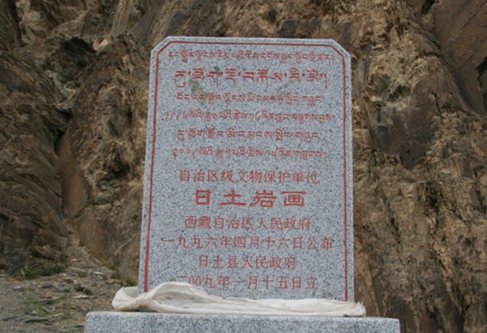 日土巖畫,文化遺址,在西藏日土縣境內。主要分布在班公措南部和東面近二、三百平方公里的區域內,最容易找到的巖畫就在日土附近的新藏公路一帶。壁畫是用堅硬的石頭或其它硬物在巖面或巖石上刻鑿而成,線條筆劃有深有淺,還有少數彩繪畫面。巖畫內容十分廣泛,有狩獵、宗教祭禮、騎乘、放牧、農耕、日、月、山、牛、馬、羊、驢、羚羊、房屋、人物等。